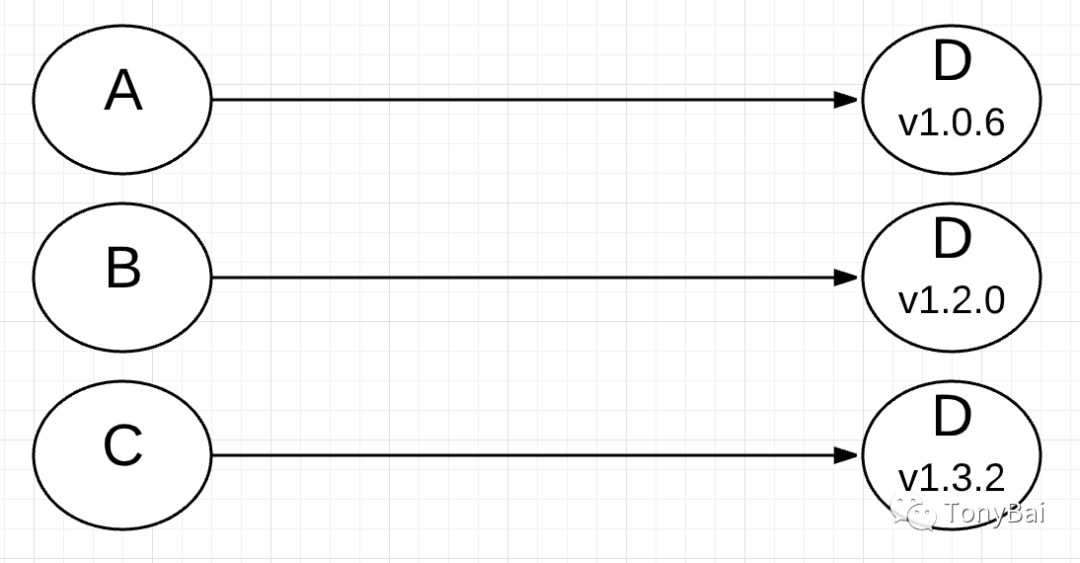 上图显示了module A,B和C如何分别独立地需要module D和各自需要D的不同版本。