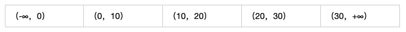 在四条记录,ID=0,10,20,30中,会产生如下的五个间隙范围