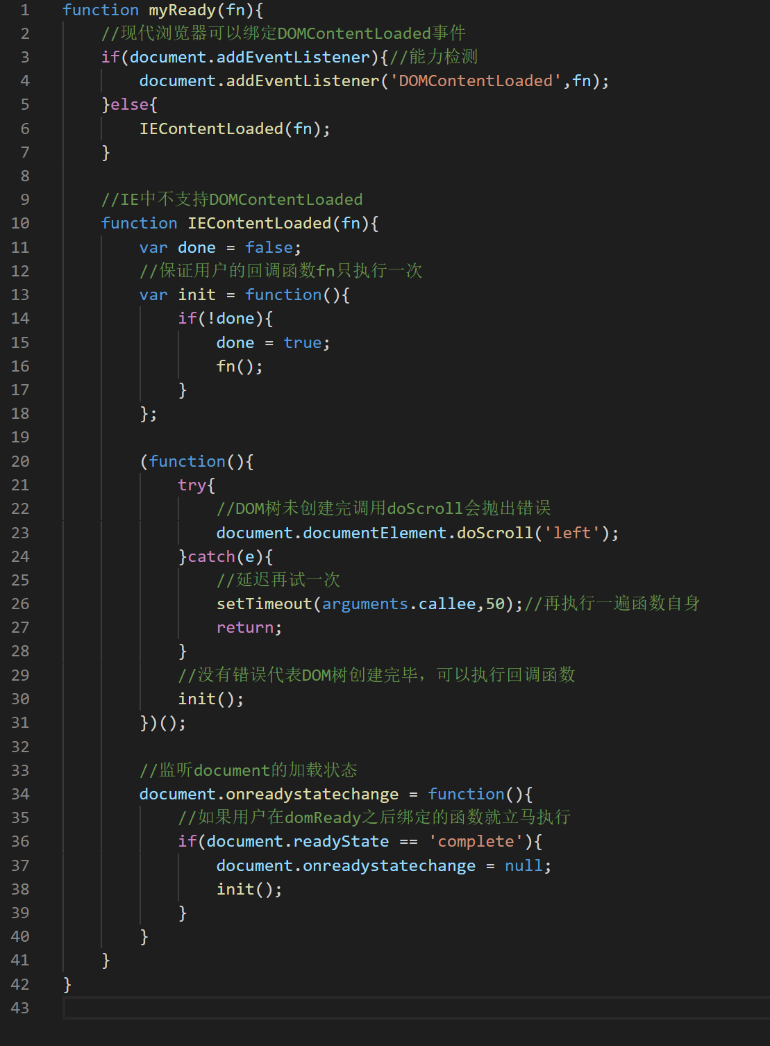 2.不支持的(IE)通过document.documentElement.doScroll('left')判断dom树是否构建完毕