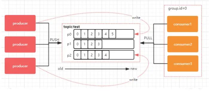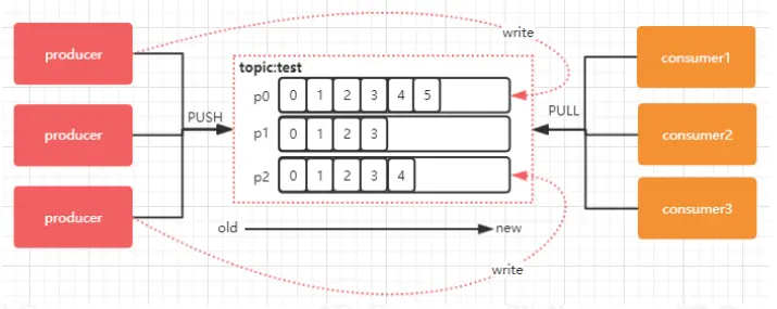 下图中,对于名字为 test 的 topic,做了 3 个分区,分别是 p0、p1、p2.