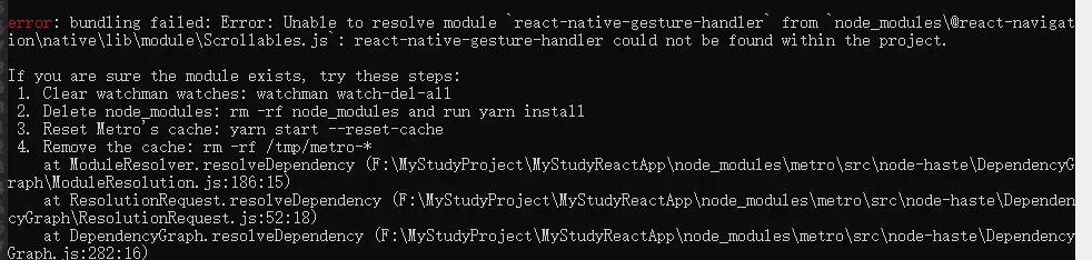 一、 Unable to resolve module react-native-gesture-handler from node_modules\@react-navigation\native\lib\module\Scrollables.js: react-native-gesture-handler could not be found within the project.