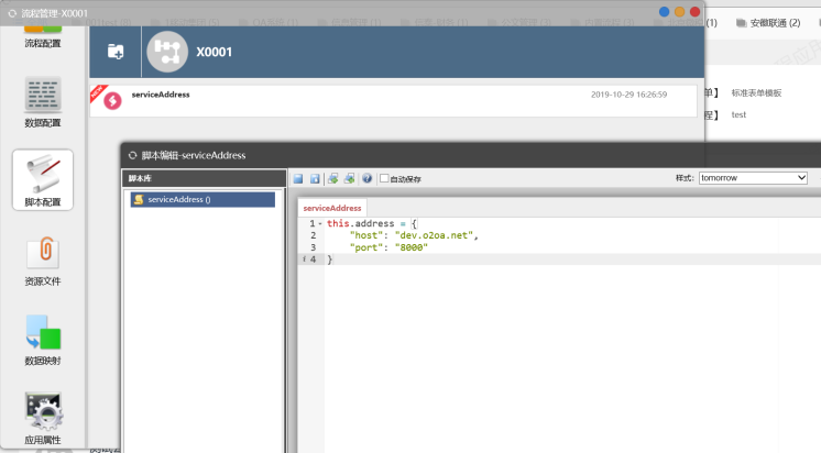 在流程应用中新建一个脚本,取名为serviceAddress(名字可任意取)。