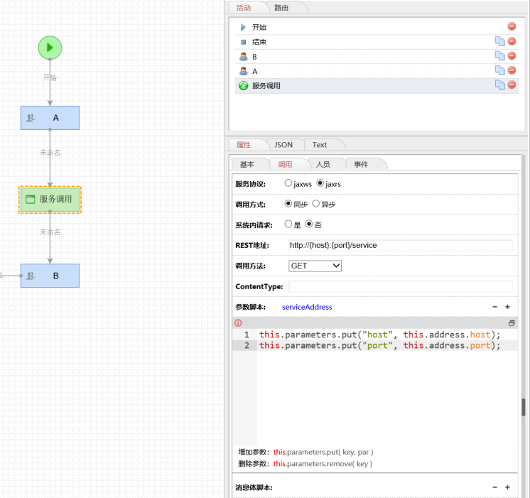http://{hostip}:{port}/service. 多数情况下,我们需要在实际运行过程中动态指定流程中需要调用的服务的地址以及其他的URL参数,那么URL的参数化也需要有一个方法来实现,本章主要讲述此功能 很多情况下,服务的地址是通过脚本,或者其他服务在执行过程中计算得到的,所以在流程定义时无法直接在服务调用环节上写死配置。比如有一个服务的地址,开发环境和测试环境的地址是不一样的,如果环境切换,所有的服务调用所有的地址都需要修改,希望有一个地方可以统一进行配置修改。 实际上脚本可以完成复杂的过程实现,为了能简单明了地说明问题,这里,我们尝试把一个服务的主机IP和服务的端口写到脚本文件里。后续到脚本里进行获取。