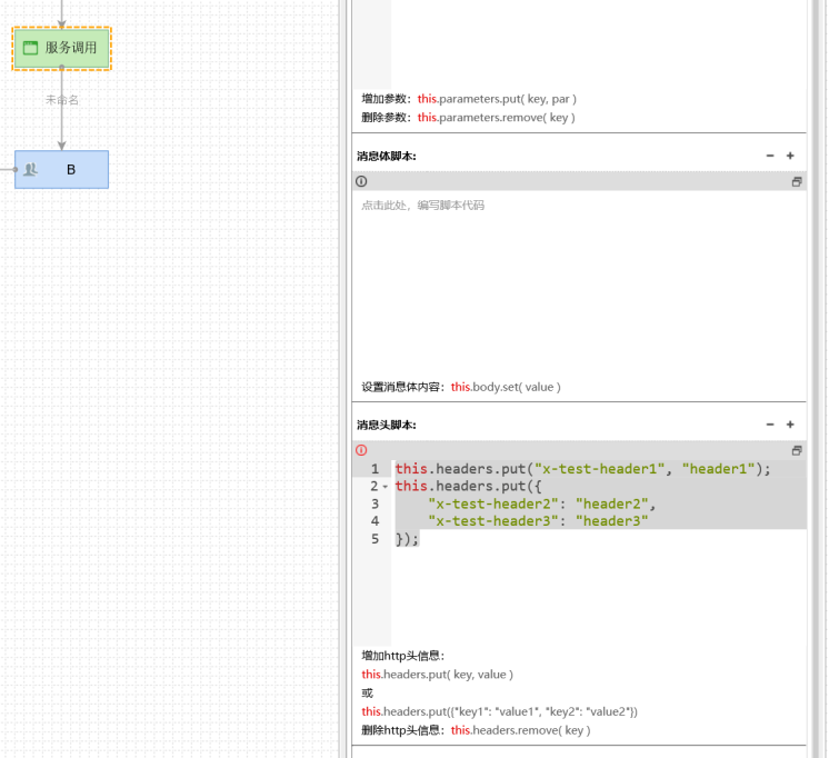 在流程服务调用活动的调用属性中,可找到“消息头脚本“,在代码框中使用: