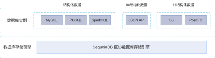 SequoiaDB 采用的是一种叫做“计算和存储分离”的架构,虽然听起来挺神奇的,但是却很好理解,上面的计算层就是一些协议的解析,它支持很多种协议,有 MySQL 的,有 JSON API 的,还有一些对象存储的协议;下面的存储层,看起来就像是一个封装好的盒子,里面可以支持数据的分布式存储。