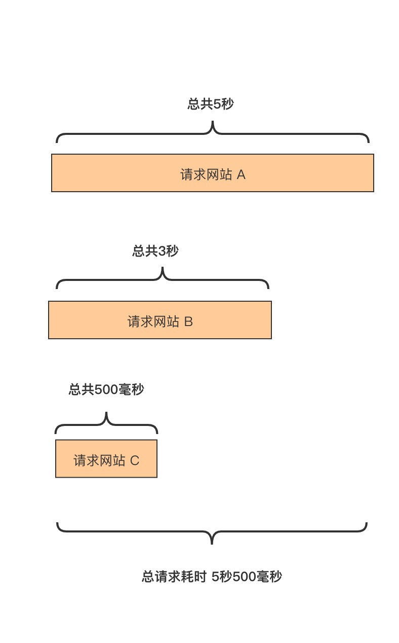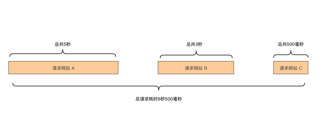 网站 A、网站 B 因为年久失修,没人维护,接口响应很慢,平均响应时间一个是 5秒,一个是 3秒(这里使用 sleep 模拟)。网站 C 性能还可以,平均响应时间 0.5 秒。而我们程序的执行时间就是 网站A 响应时间 + 网站 B 响应时间 + 网站 C 响应时间。