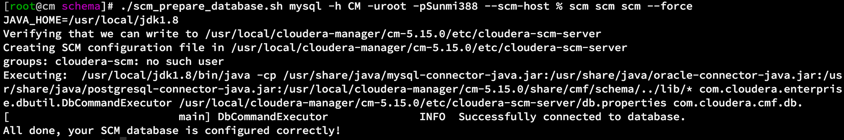 /usr/local/cloudera-manager/cm-5.15.0/share/cmf/schema/scm_prepare_database.sh mysql -h cm -uroot -pSunmi388 --scm-host % scm scm scm --force