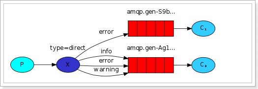 C2:消费者,其所在队列指定了需要routing key 为 info、error、warning 的消息