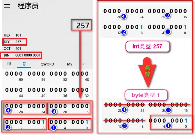 byte a = (byte)257;System.out.println(a); //运行发现结果为1造成这一结果的原因: