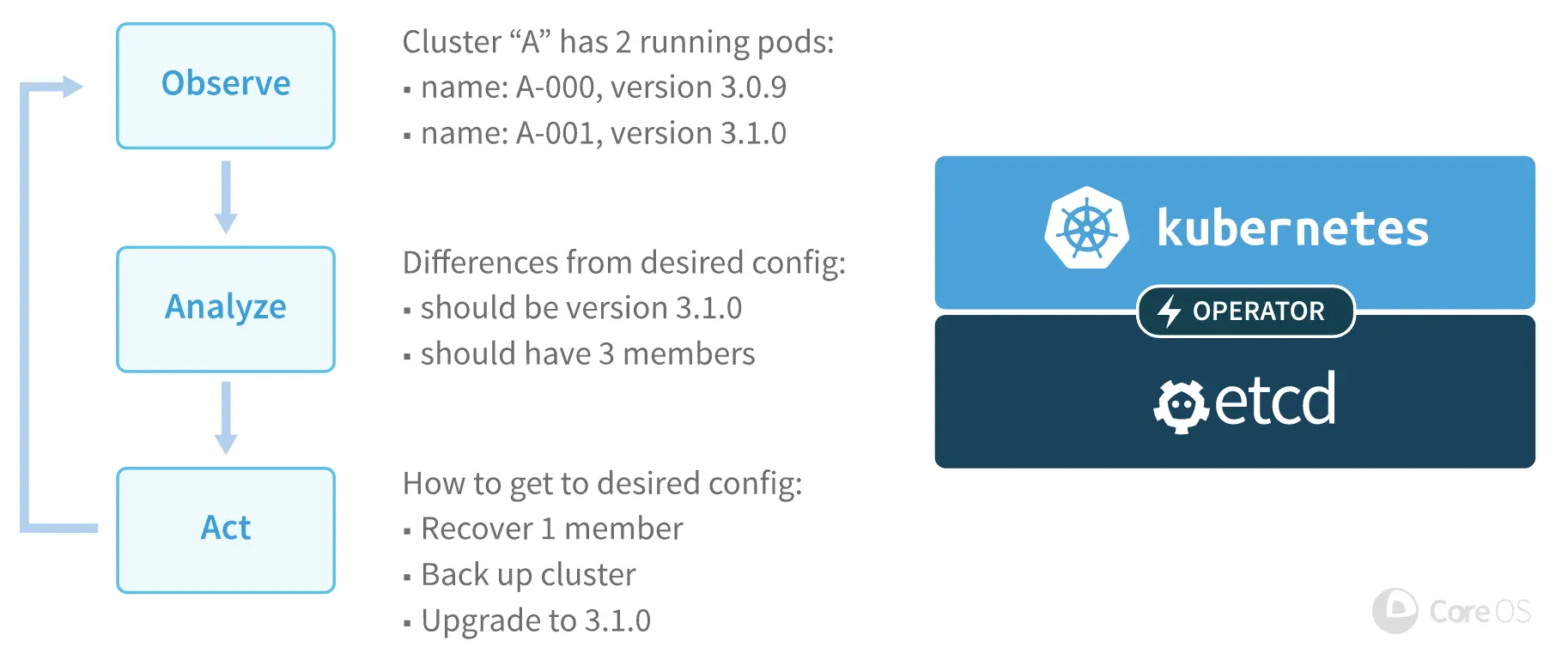 以 ETCD Operator 为例,假如你想手动扩展一个 ETCD 集群,一般的做法是: