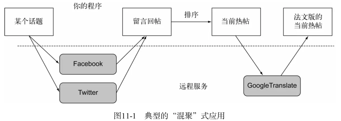 某个网站的数据来自Facebook、Twitter和Google,这就需要网站与互联网上的多个Web服务通信。可是,你并不希望因为等待某些服务的响应,阻塞应用程序的运行,浪费数十亿宝贵的CPU时钟周期。比如,不要因为等待Facebook的数据,暂停对来自Twitter的数据处理。