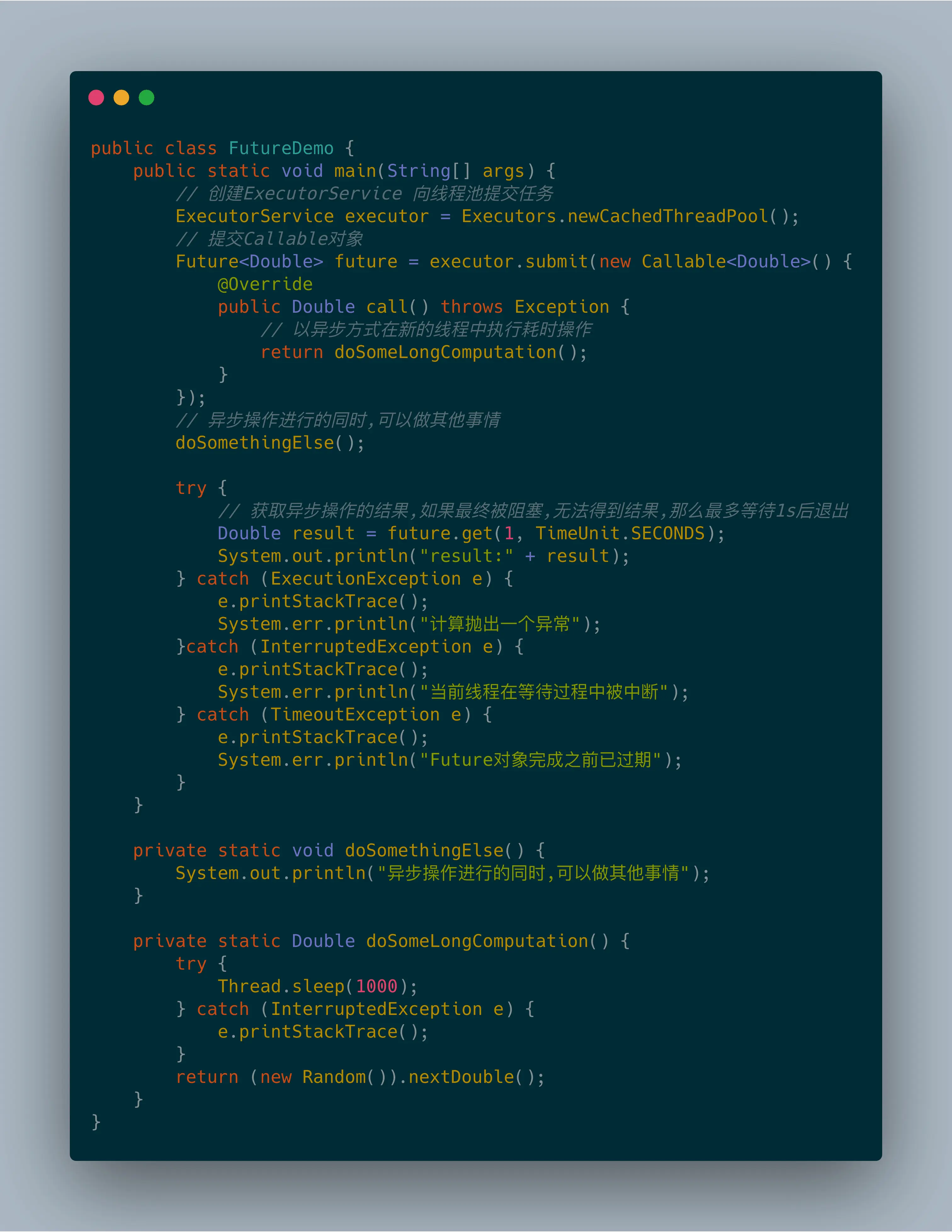 Future接口在Java 5中被引入,设计初衷是对将来某个时刻会发生的结果进行建模。它建模了一种异步计算,返回一个执行运算结果的引用,当运算结束后,这个引用被返回给调用方。在Future中触发那些潜在耗时的操作把调用线程解放出来,让它能继续执行其他有价值的工作,不再需要等待耗时的操作完成。Future的另一个优点是它比更底层的Thread更易用。要使用Future,通常你只需要将耗时的操作封装在一个Callable对象中,再将它提交给ExecutorService。使用Future以异步的方式执行一个耗时的操作: