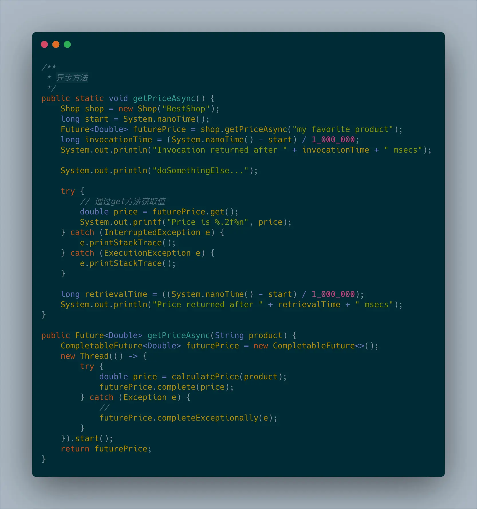 Java 5引入了java.util.concurrent.Future接口表示一个异步计算(即调用线程可以继续运行,不会因为调用方法而阻塞)的结果。这意味着Future是一个暂时还不可知值的处理器,这个值在计算完成后,可以通过调用它的get方法取得。这种方式下,在进行价格查询的同时,还能执行一些其他的任务,比如查询其他商店中商品的价格,不会阻塞在那里等待第一家商店返回请求的结果。最后,如果所有有意义的工作都已经完成,所有要执行的工作都依赖于商品价格时,再调用Future的get方法。执行了这个操作后,要么获得Future中封装的值(如果异步任务已经完成),要么发生阻塞,直到该异步任务完成,期望的值能够访问。同时,如果某个商品价格计算发生异常,会将当前线程杀死,从而导致等待get方法返回结果的客户端永久地被阻塞。客户端可以使用重载版本的get方法,设置超时参数来避免。为了让客户端能了解无法提供请求商品价格的原因,你需要使用CompletableFuture的completeExceptionally方法将导致CompletableFuture内发生问题的异常抛出。