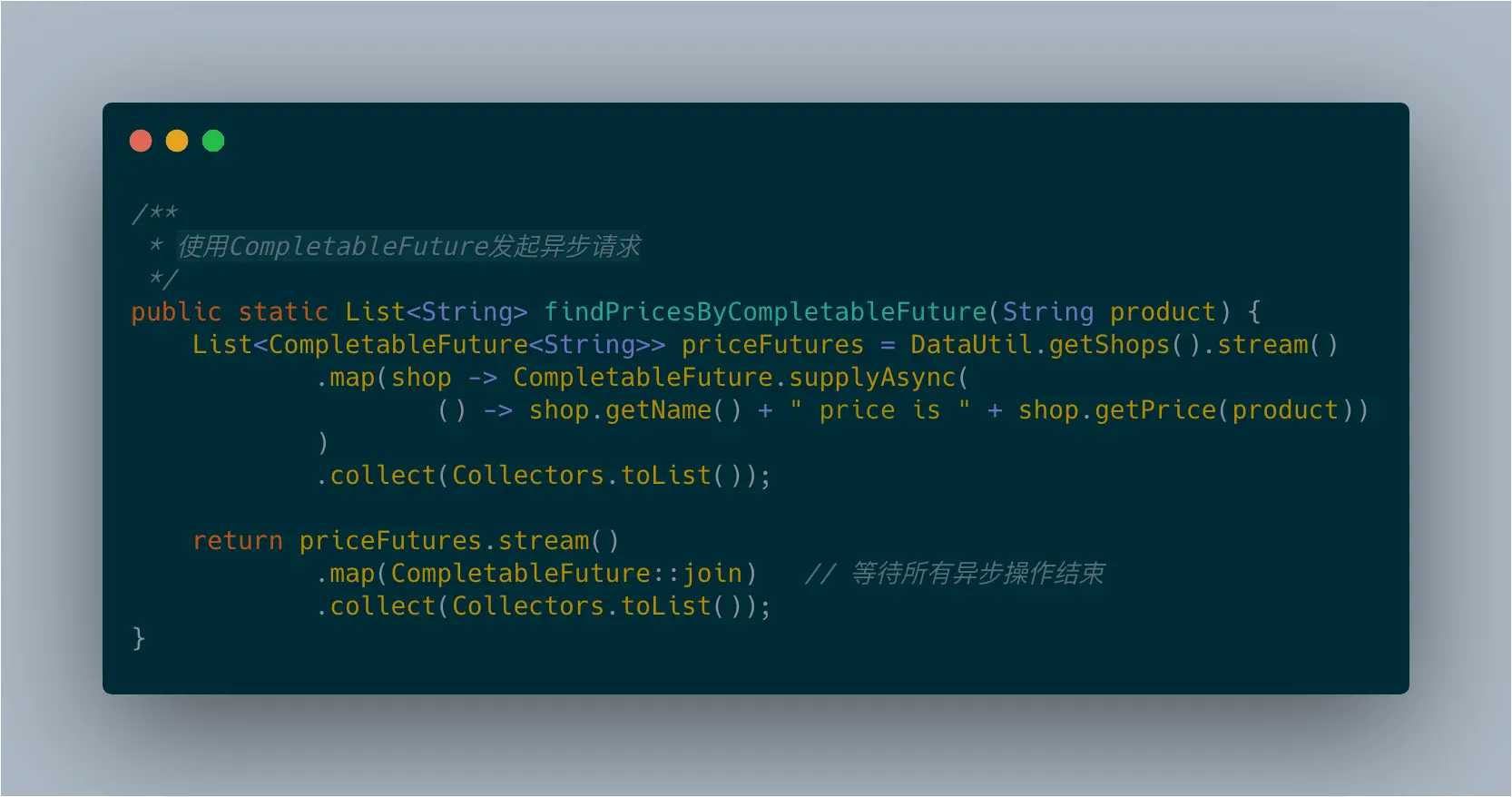 - 你应该尽可能地为客户提供异步API。使用CompletableFuture类提供的特性,你能够轻松地实现这一目标。