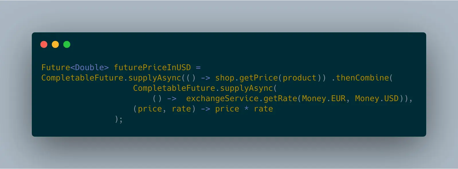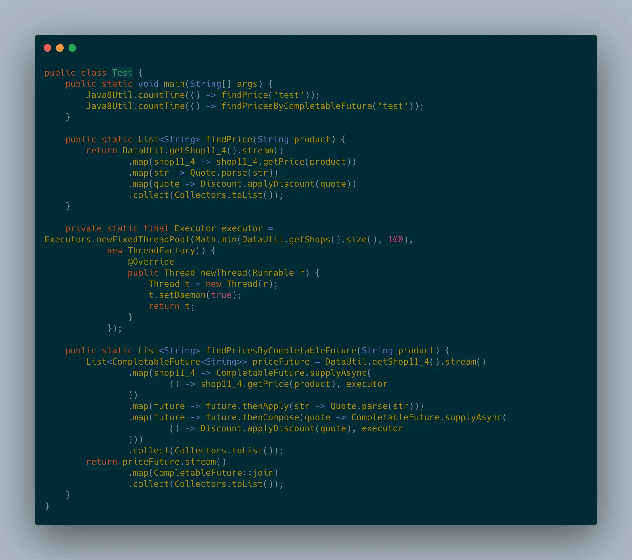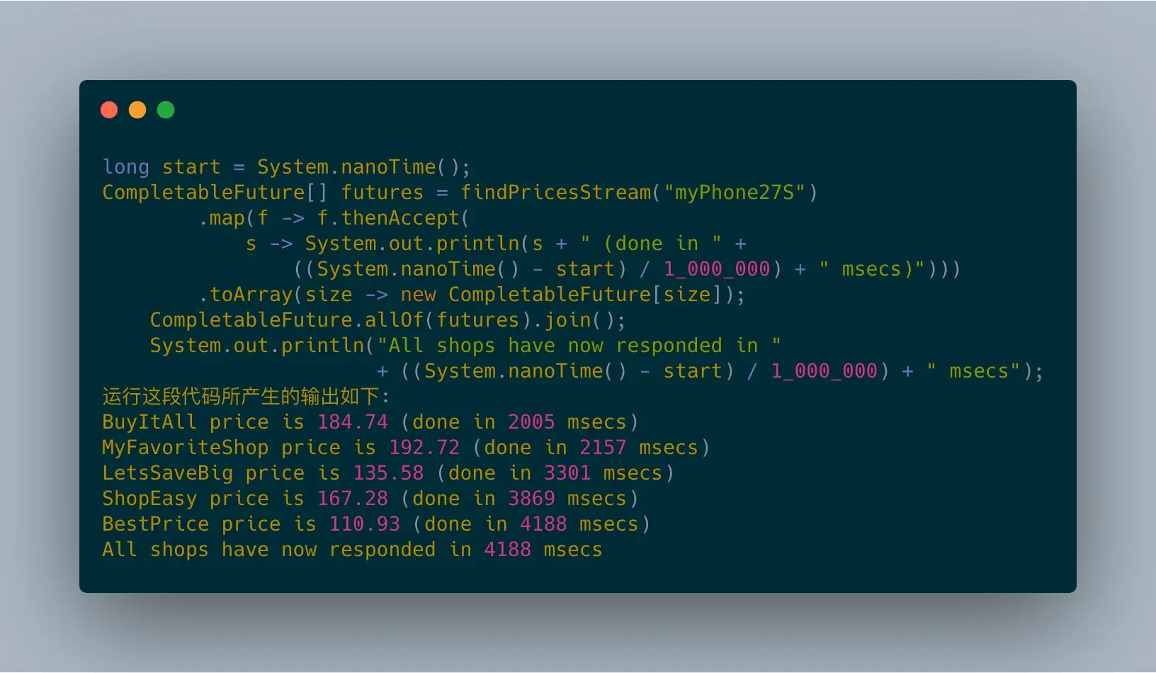 - 第三个map会操作联系远程的Discount服务,计算出最终的折扣价格,并返回该价格及提供该价格商品的shop。