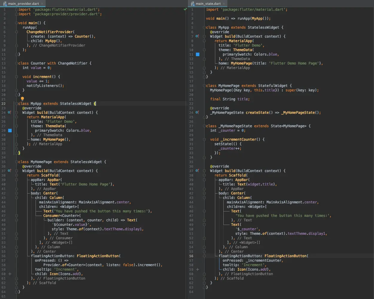 我们对照下用provider和widget state的方式来实现Flutter Project App默认模板项目计数器功能:
