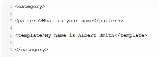 如下面的代码段所示,为了编写出不同的模型和响应,人工智能标记语言(Artificial Intelligence Markup Language,AIML)被普遍地运用在聊天机器人的开发过程中。