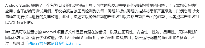 - 有可能发生bug的地方:Probable bugs(比如空指针) ...... Lint自带的检查规则有很多,一一举例不现实,碰到不懂的单词,搜索一下就可以了。在改的时候也要根据实际情况,看是否合理,Lint也不代表百分百是对的。