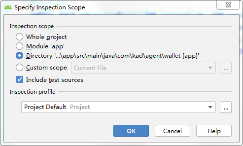 方法二:找到你想要检查内容的最顶层的那一层。打个比方,负责的项目是“钱包”部分,在studio里面文件夹名字是“wallet”,里面包含了所有这部分功能的代码,如果只想检查钱包部分的代码,那么就选中这个文件夹,右键就能找到Analyze -> Inspect Code…,想检查单个文件就选中单个文件,然后右击,一样的效果。点击Inspect Code就出现如下弹框