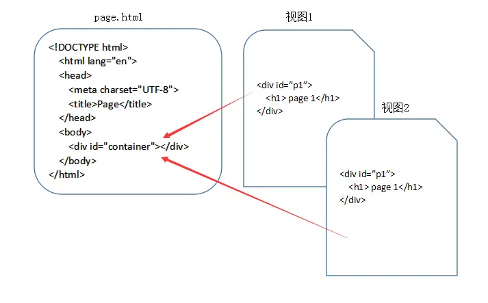 - 在 SPA 的应用设计中,一个应用只有一个HTML文件,在HTML文件中包含一个占位符(即图中的 container),占位符对应的内容由每个视图来决定,对于 SPA 来说,页面的切换就是视图之间的切换。