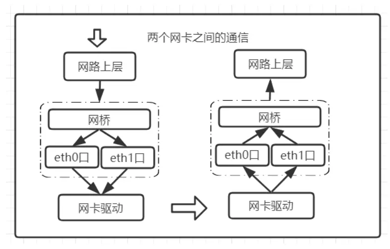 从eth0 或 eth1来的报文提交给网桥后,由网桥判断报文应该被转发,丢失或者提交到上