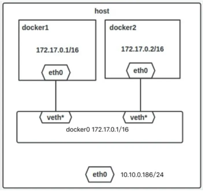 - Docker创建出来的每一个容器,都会创建一个虚拟的以太网设备(Veth设备对),一端放到宿主机的网络命名空间并关联到网桥,另一端映射到容器内的eth0, 然后从docker0网桥的地址段给eth0接口分配一个IP地址。