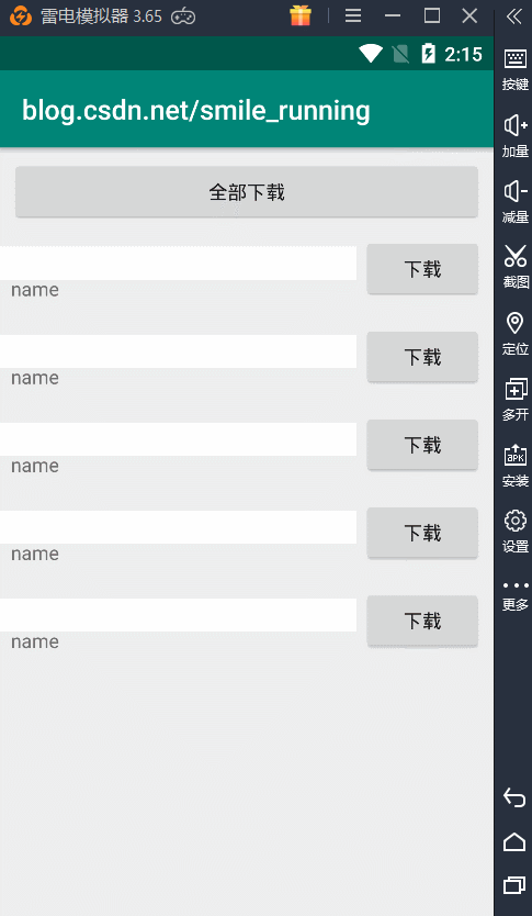可以看到就是这样效果,这里的每次点击 下载 按钮,都会开启一个子线程来更新进度条操作。注意了:这里我们看到的 name 就是线程的名字。可以观察到,5个下载任务所用的线程都是不同的,所以它们的线程名都不一样。