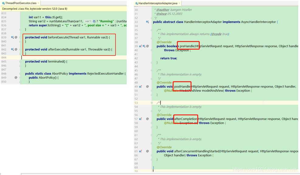 这两个方法是protected修饰的,很显然是留给开发人员去重写方法体实现自己的业务逻辑,非常适合做钩子函数,在任务run方法的前后增加业务逻辑,比如添加日志、统计等。这个和我们springmvc中拦截器的preHandle和afterCompletion方法很类似,都是对方法进行环绕,类似于spring的AOP,参考下图: