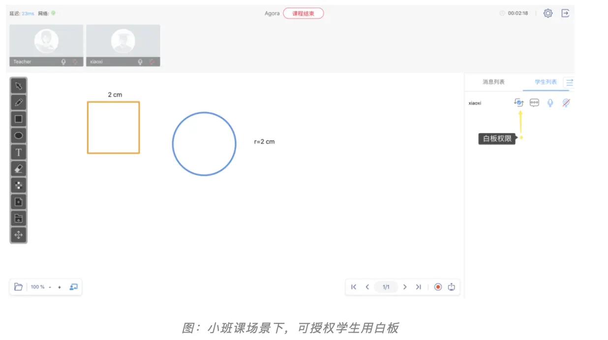 教学白板:在以上三个场景中,都支持白板功能。1 对 1 互动教学中,老师和学生都可以操作白板;1 对 1 在线小班课、低延迟大班课中,可以授权学生操作白板。