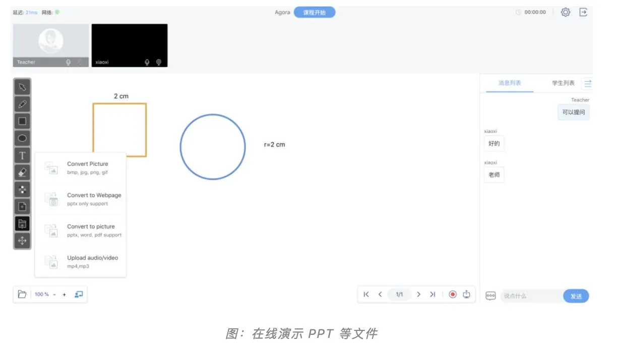 共享PPT等文件:老师可以在授课的同时,共享 PPT、PDF、word、图片、mp4、mp3 等多媒体文件。学生端只能观看,不能上传。