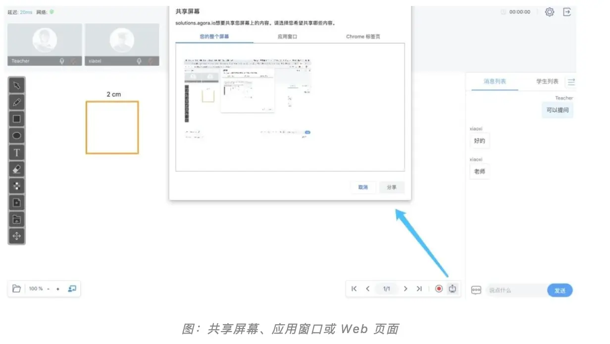 屏幕共享:老师可以发起屏幕共享,展示桌面、网页或其他应用窗口。