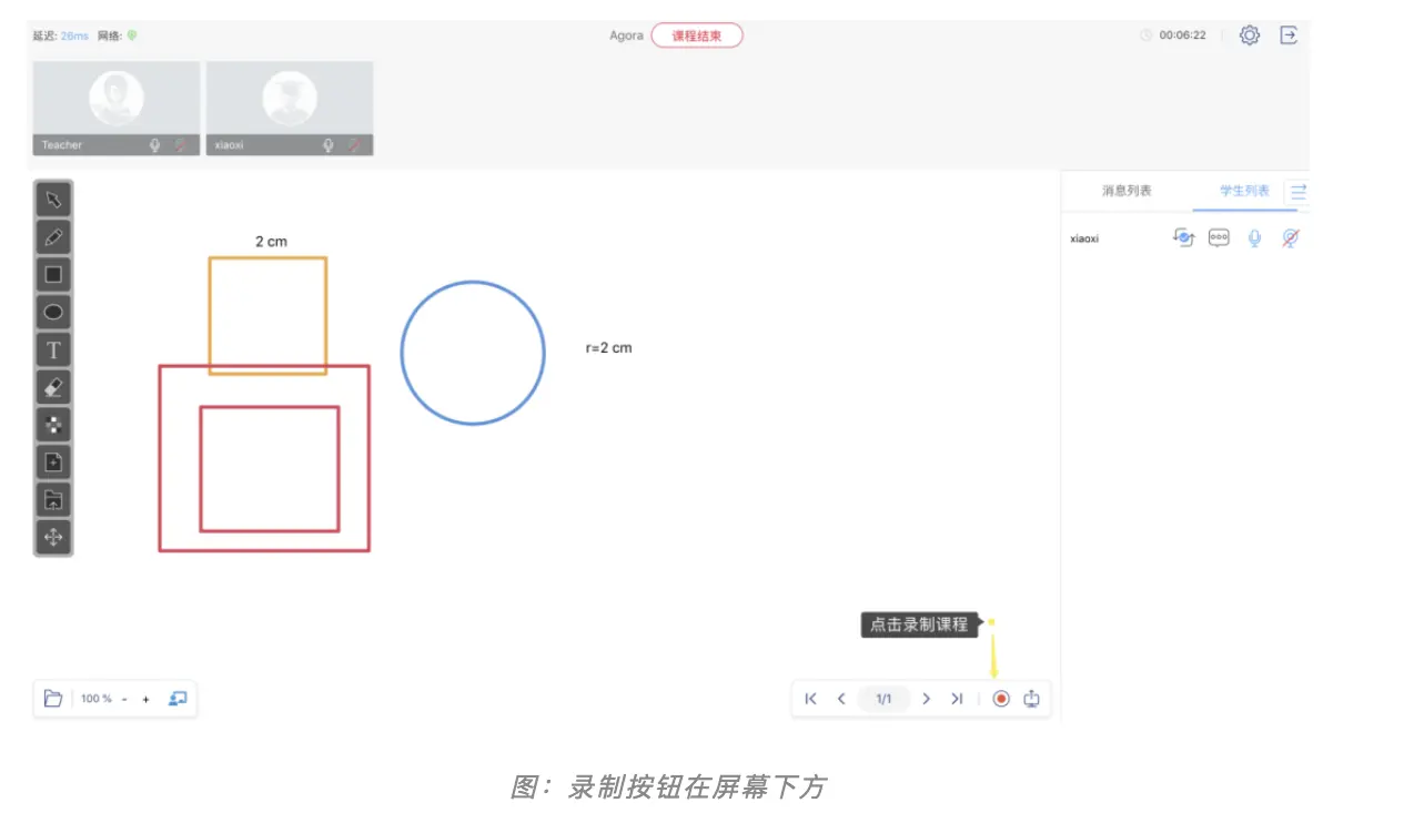 录制回放:老师登录 Web端,可以进行课程录制。在白板的下方,有录制按钮,制完成后,在右侧的消息窗口中会自动弹出回放地址。