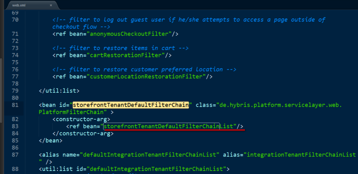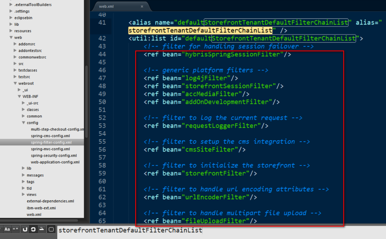 再到config folder下找到spring-filter-config.xml,把chain id storefrontTenantDefaultFilterChain抄下来: