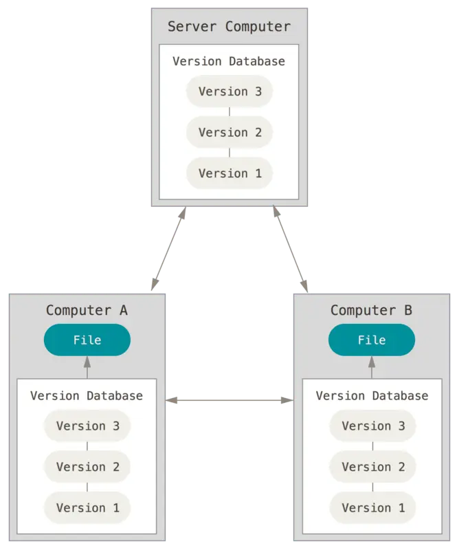 Git属于分布式版本控制系统(Distributed Version Control System,简称 DVCS), 在这类系统中,像 Git、Mercurial、Bazaar 以及 Darcs 等,客户端并不只提取最新版本的文件快照,而是把代码仓库完整地镜像下来。 这么一来,任何一处协同工作用的服务器发生故障,事后都可以用任何一个镜像出来的本地仓库恢复。 因为每一次的克隆操作,实际上都是一次对代码仓库的完整备份。