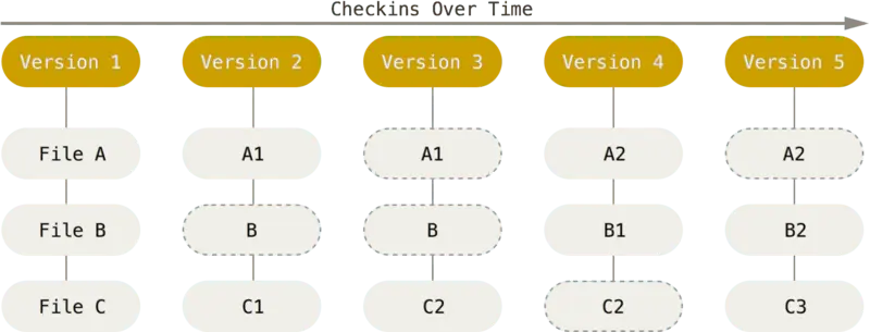 Git更像是把数据看作是对小型文件系统的一组快照。 每次你提交更新,或在 Git 中保存项目状态时,它主要对当时的全部文件制作一个快照并保存这个快照的索引。 为了高效,如果文件没有修改,Git 不再重新存储该文件,而是只保留一个链接指向之前存储的文件。Git对待数据更像是一个 快照流。