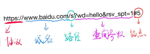 - 协议 + 域名或 IP + 端口号 + 路径 + 查询字符串 + 锚点