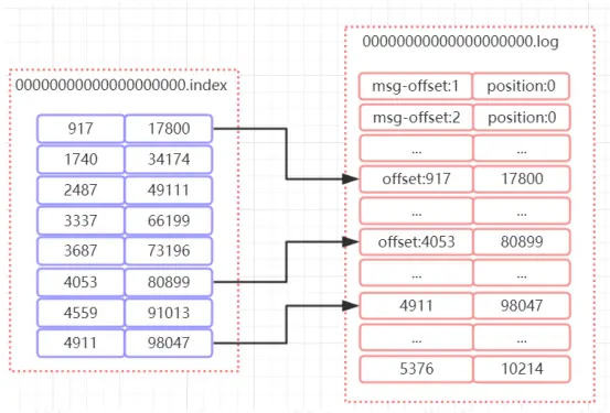 - 根据 offset 的值,查找 segment 段中的 index 索引文 件。由于索引文件命名是以上一个文件的最后一个 offset 进行命名的,所以,使用二分查找算法能够根据 offset 快速定位到指定的索引文件。