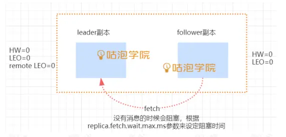 初始状态下,leader 和 follower 的 HW 和 LEO 都是 0, leader 副本会保存 remote LEO,表示所有 follower LEO, 也会被初始化为 0,这个时候,producer 没有发送消息。 follower 会不断地个 leader 发送 FETCH 请求,但是因为没 有数据,这个请求会被 leader 寄存,当在指定的时间之后 会 强 制 完 成 请 求 , 这 个 时 间 配 置 是 (replica.fetch.wait.max.ms),如果在指定时间内 producer 有消息发送过来,那么 kafka 会唤醒 fetch 请求,让 leader 继续处理