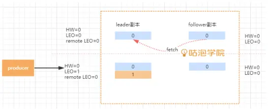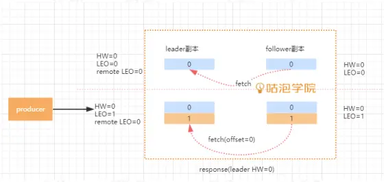 - 更新 remote LEO=1, 因为这次 fetch 携带的 offset 是1.