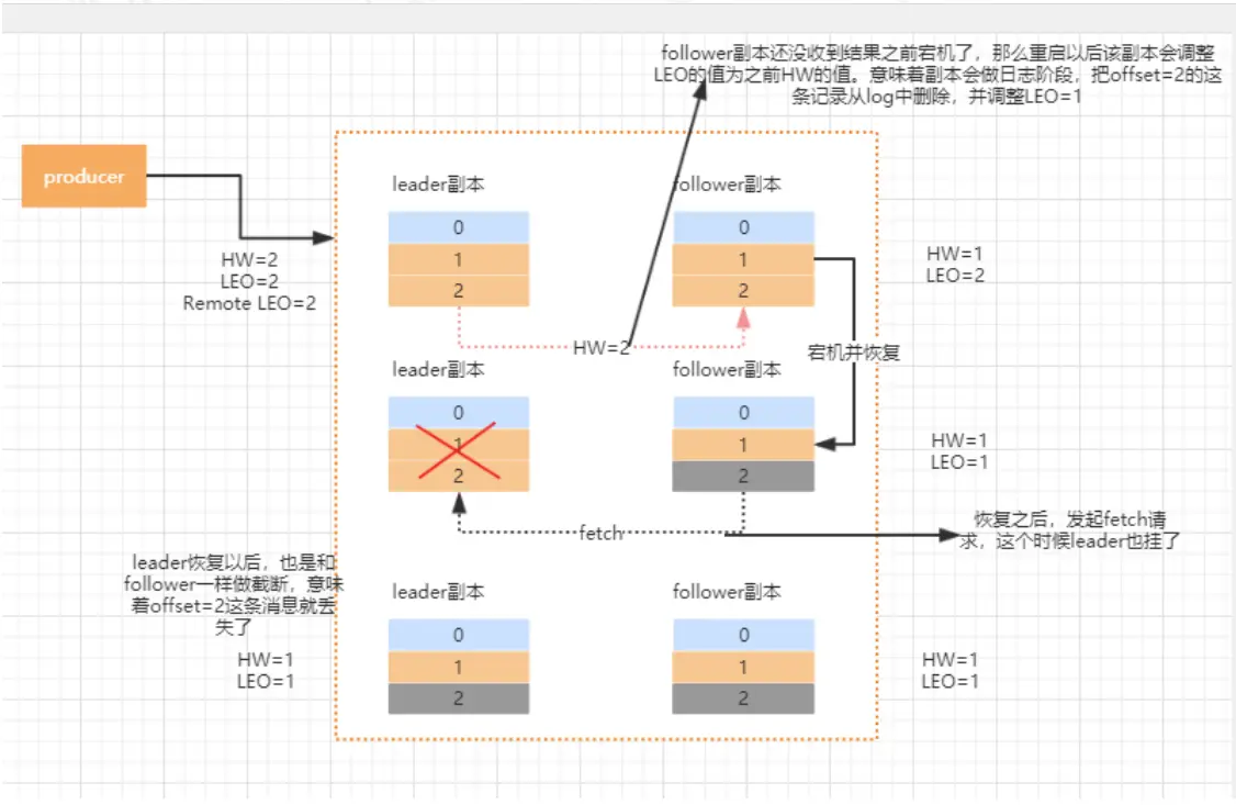 kafka 使用 HW 和 LEO 的方式来实现副本数据的同步,本 身是一个好的设计,但是在这个地方会存在一个数据丢失 的问题,当然这个丢失只出现在特定的背景下。我们回想 一下,HW 的值是在新的一轮 FETCH 中才会被更新。我们 分析下这个过程为什么会出现数据丢失