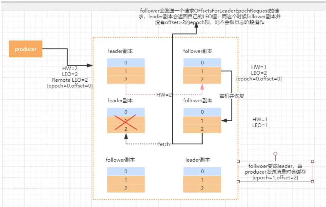 当 leader 写 log 时它会尝试更新整个缓存——如果这个 leader 首次写消息,则会在缓存中增加一个条目;否则就 不做更新。而每次副本重新成为 leader 时会查询这部分缓 存,获取出对应 leader 版本的 offset