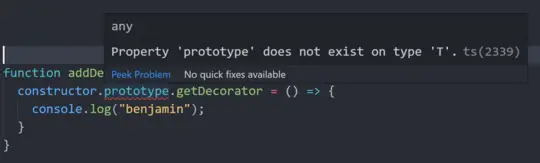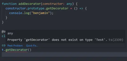那么原因是在于我们的t实例在创建的时候,它本身并没有getDecorator这个方法,它是装饰器偷偷装饰上去的,而TypeScript推断不出来,我们就需要修改一下写法:
