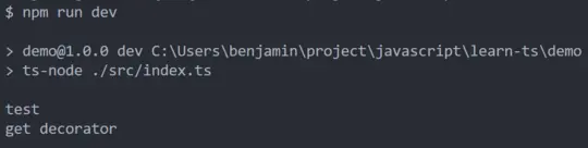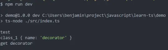 这里我们用工厂函数返回一个装饰器函数,然后用这个返回的装饰器函数去包装一下 Test 类,TypeScript 就能感知到 getDecorator 函数被添加到了 Test 类上,代码就不会有任何报错了,我们虽然没有用@的装饰器的语法,但我们也没有改变 Test 类,是装饰器的另一种实现,运行代码: