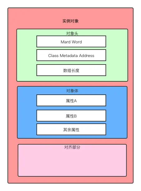 对象头一般由两部分组成:Mark Word 和 Class Metadata Address。如果是数组类型,则对象头中会多一项:Array Length,也就是存储数组的长度。