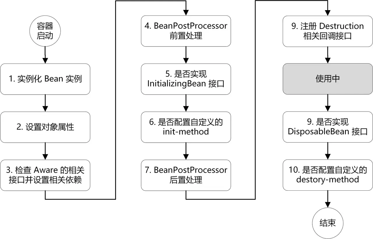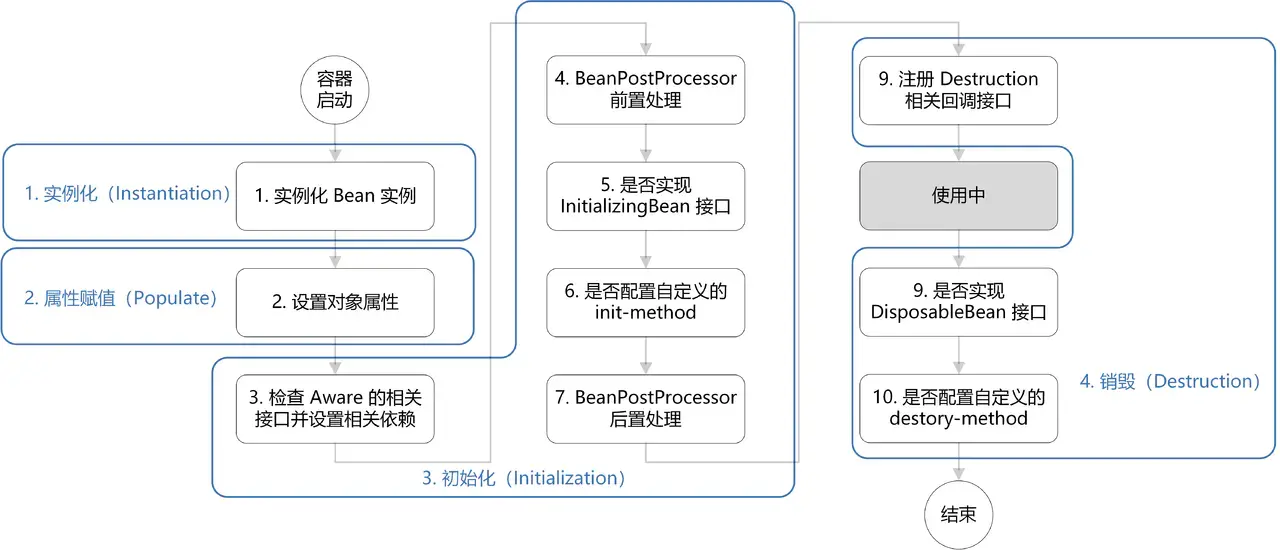 销毁:第 8~10步,第8步不是真正意义上的销毁(还没使用呢),而是先在使用前注册了销毁的相关调用接口,为了后面第9、10步真正销毁 bean 时再执行相应的方法。