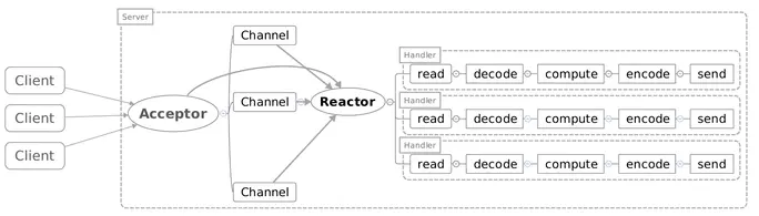 从结构上看,Reactor类似于生产消费模式,也就是一个或多个生产者会将事件放入一个队列中,一个或多个消费者主动从队列中poll拉取事件进行处理。Reactor并没有使用队列来做缓冲,每当一个事件输入到服务处理程序之后,服务处理程序会主动根据不同的事件类型将其分发给对应的请求处理程序进行处理。