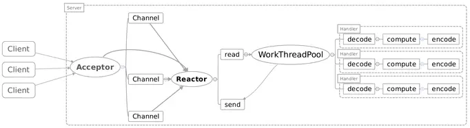 线程池方案的最大缺点是:如果瞬间有大并发,则会一下子耗满线程,整个服务将会陷入阻塞中,后续请求无法介入。基于Reactor模式实现的方案,会有一个Dispatcher先接收事件event,然后快速分发给相应的耗时eventHandler处理器去处理,这样就不会阻塞请求的接收。