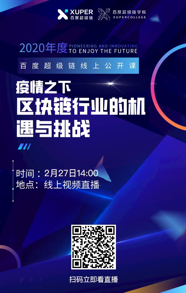 大家好!百度超级链线上公开课“疫情之下,区块链行业的机遇与挑战”将在明天下午14:00开讲,届时来自百度超级链和百信银行的专家将会分享疫情与区块链结合的思考,以及区块链助力中小企业获得融资的实践,敬请期待!