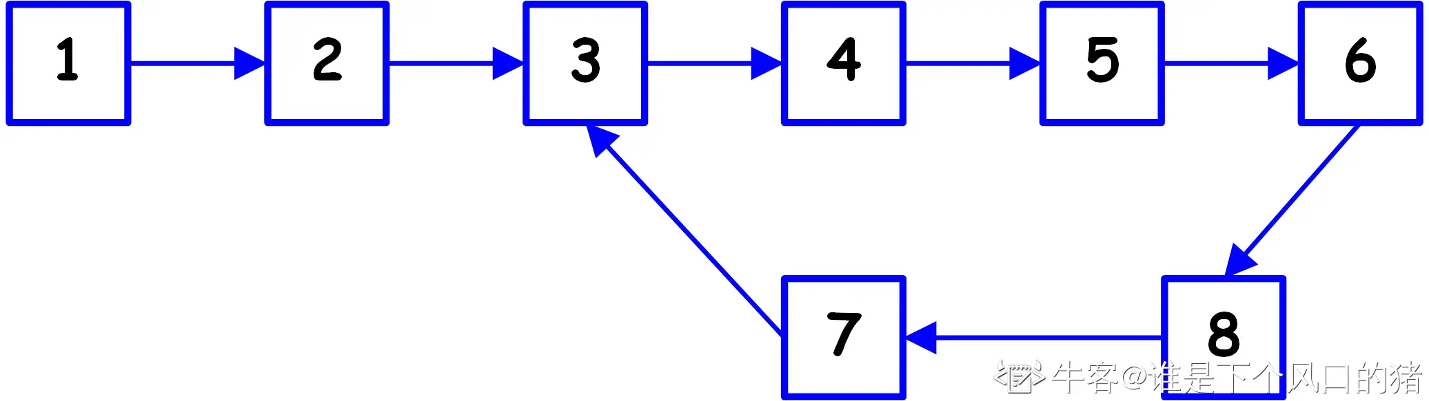 所以当快慢指针相遇后,从相遇点到环入口的距离与从链表头到环入口的距离一样。通过设置一指针从链表头部前进,一指针从相遇点同时前进,两指针相遇的位置即是链表环的入口。