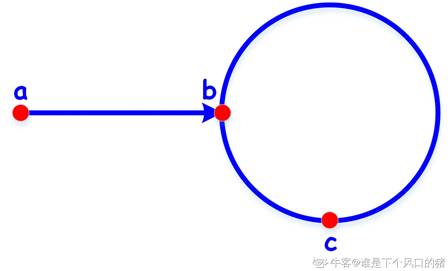 快指针每次前进2步,慢指针每次前进1步。若链表有环,则快慢指针会在环内相遇。假设图中b是环的入口,a为链表起点,c为快慢指针相遇的位置。由于快慢指针的前进时间相同,则根据速度关系可得:
